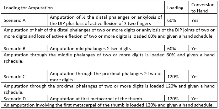 - Scenario A – In cases of loss of three fingers with less than 50% loss of use in each finger, are given a 30% load and converted to a hand schedule.